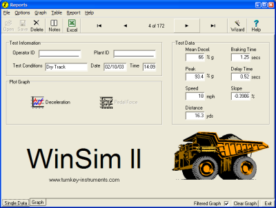 Brake tests, including graphs, can be displayed on the screen and printed. WinSim II also organises the brake tests into a database, which can be searched, for example by combinations of test date, examiner, vehicle name and instrument serial number.